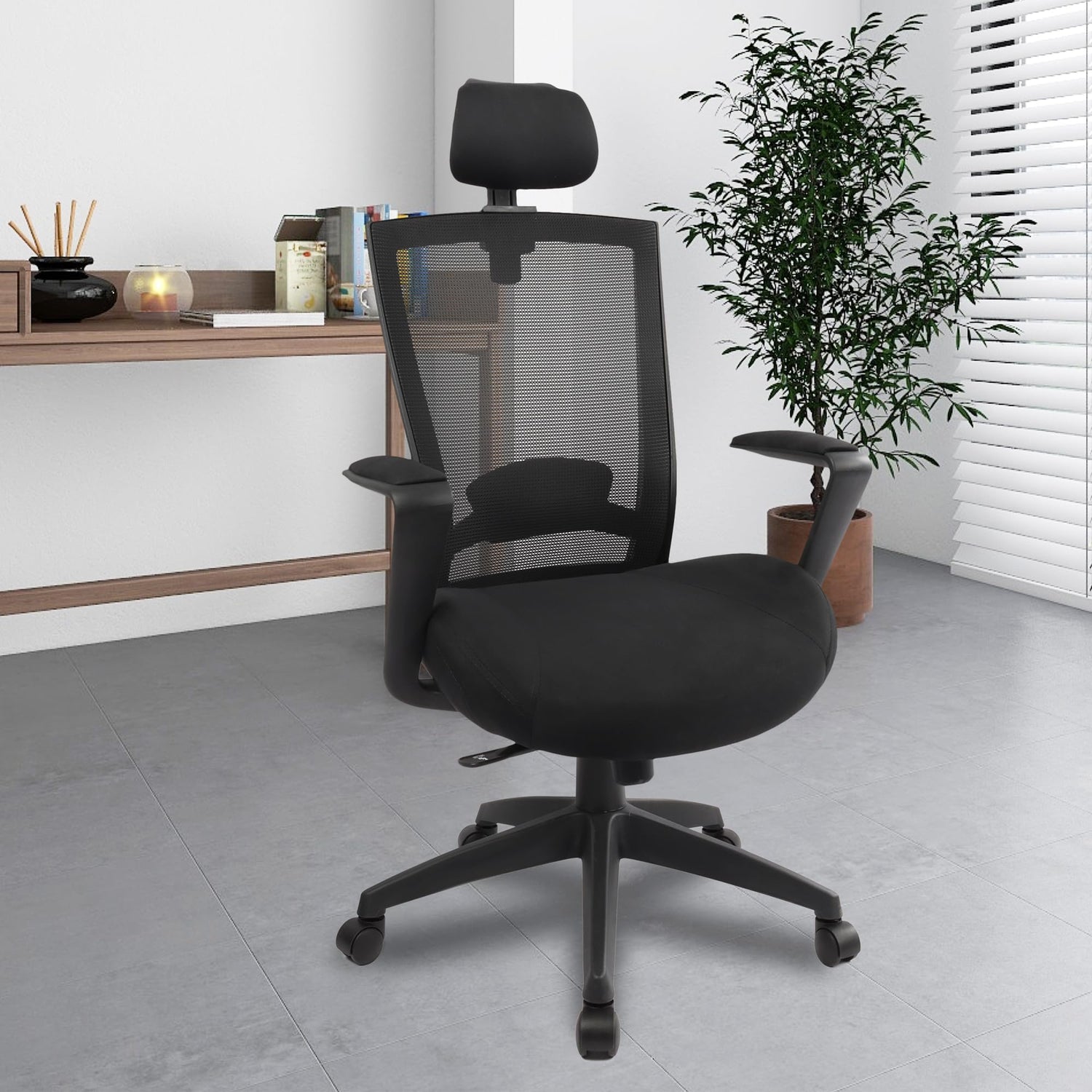 - This computer desk office chair has adjustable headrest which give comfort and support for your head and shoulders. Featuring a 360° swivel - height-adjustable mechanism - back angle and rocking system to rock back and forth at any angle up to 125°. Underneath the tilt tension knob controls the tension of reclining. Also, comes with adjustable lumbar support, so you can move up and down to the desired height according to your needs.