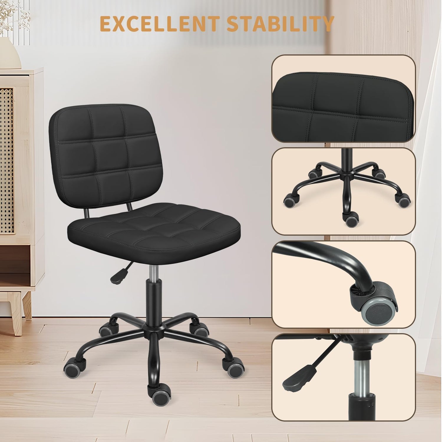 - Adjustable Space Saving: The height-adjustable dimensions ensure the small armless office chair will fit perfectly into any office or workspace. The armless design makes it easy to store it under your desk when not in use, maximizing the available space in your office, bed room, and vanity area.