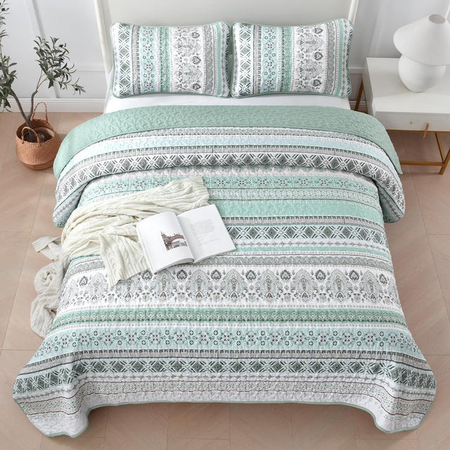 Boho Quilt Set Queen Size,3 Piece Mint Green Bohemian Striped Bedspread Coverlet Set