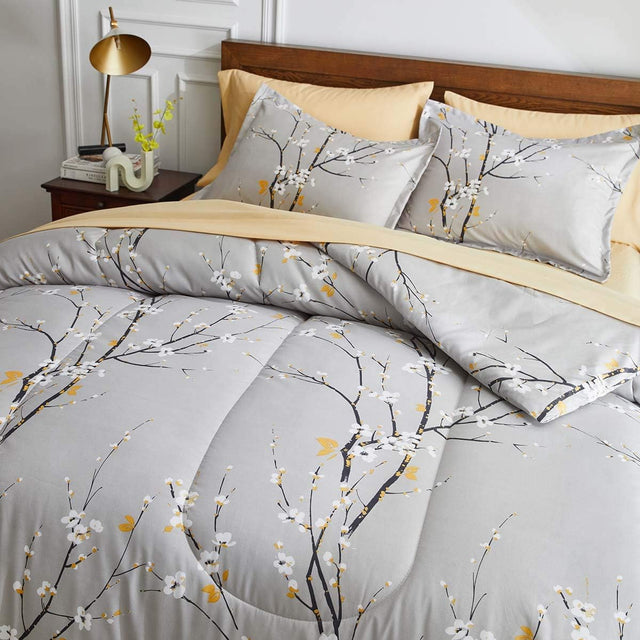 Gray Comforter Sheet Set Bed in a Bag 7 Pieces King Size Tree Branch Bloom Flower Spring Summer Bedding Set (1 Comforter 2 Pillow Shams 1 Tan Flat Sheet 1 Fitted Sheet 2 Pillowcases)