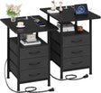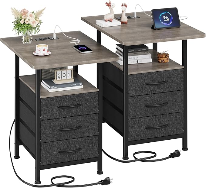 Night Stand Set 2 with 19'' D Larger Tabletop and 3 Fabric Drawer, Bedside Tables with Fast Charging Station
