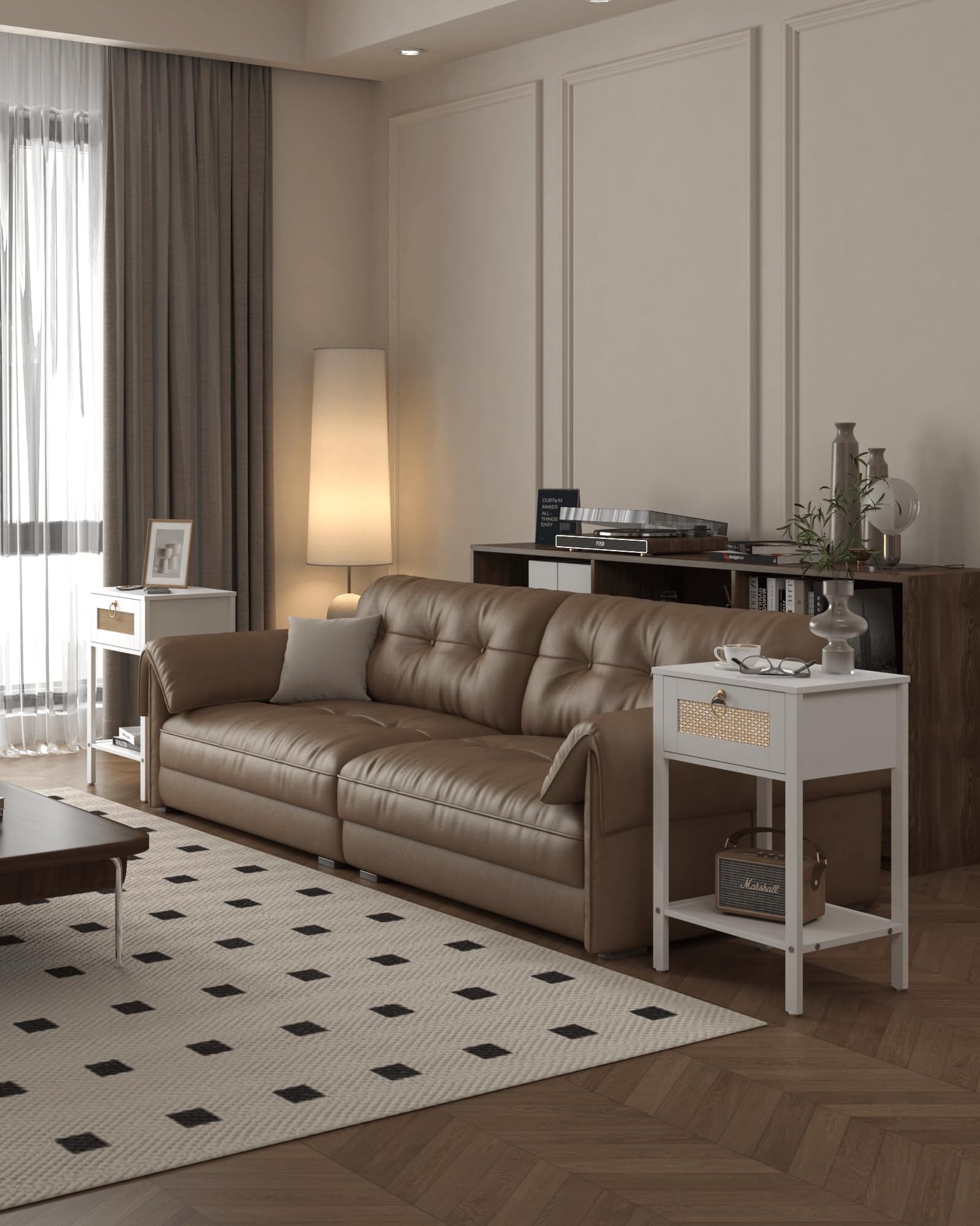 JOONEE Rattan Nightstand,White Modern Farmhouse Bedside Table with Storage Drawer and Shelf