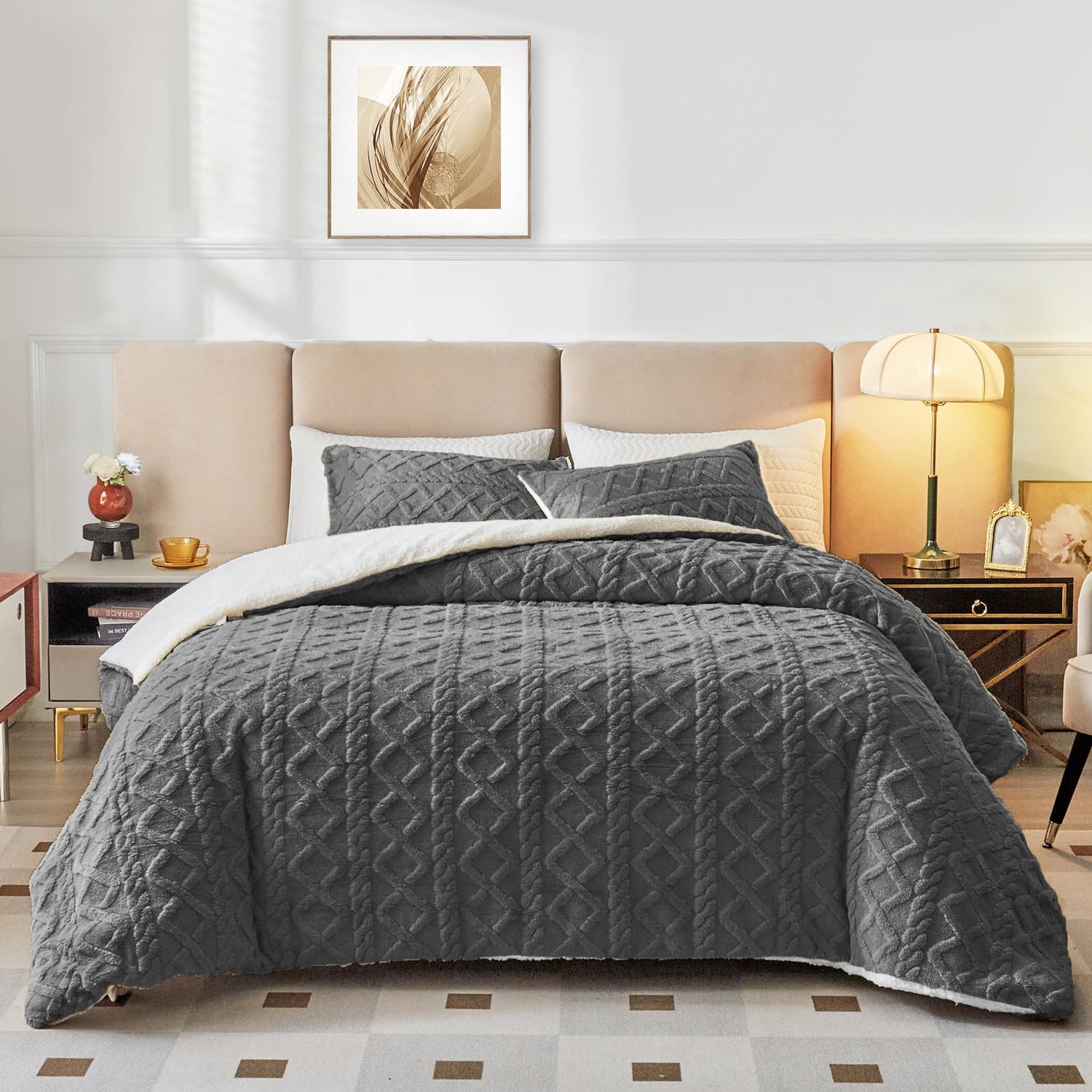 3-Piece Fluffy Faux Fur Sherpa Comforter Set Gray, King Size Luxury Tufted Bedding