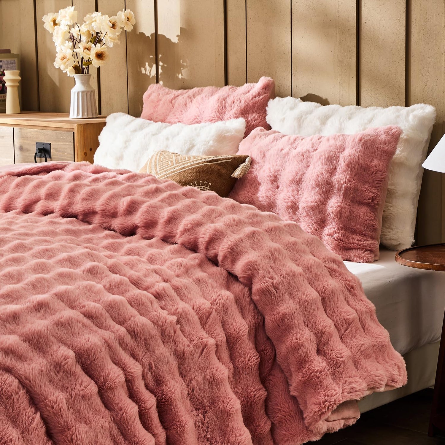 Faux Fur Queen Comforter Set – Pink Fluffy Comforter Queen Size, Big Bubble Faux Rabbit