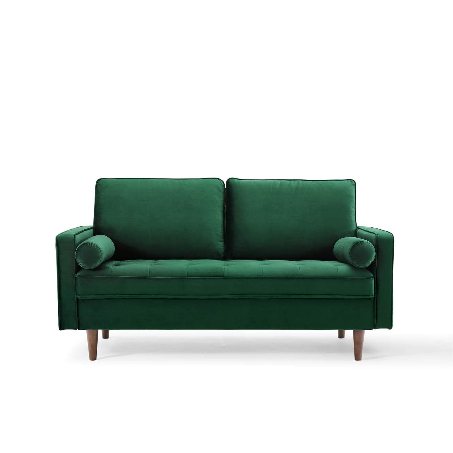 Details: Update your home or apartment with the mid-century style and modern-day convenience of Valour. This comfortable living room loveseat features a tailored profile with elegant biscuit tufting and two bolster pillows. Covered in soft, stain-resistant performance velvet upholstery, Valour has dense foam padding, individually wrapped innerspring pocket coils, and sinuous spring support for a comprehensive seating experience. This luxe modern two-seater sofa comes with walnut-stained wood legs with non-marking foot caps and supports up to 600 lbs. Say goodbye to the days of hauling heavy furniture. This tufted loveseat ships in a portable box for easy maneuvering.