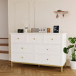 • In a pure white with gold handles, this 7 drawer dresser will adapt to any color palette and easily anchor different bedroom styles. More than just a storage solution, it's a statement piece with lasting appeal that will enhance and transform your space.