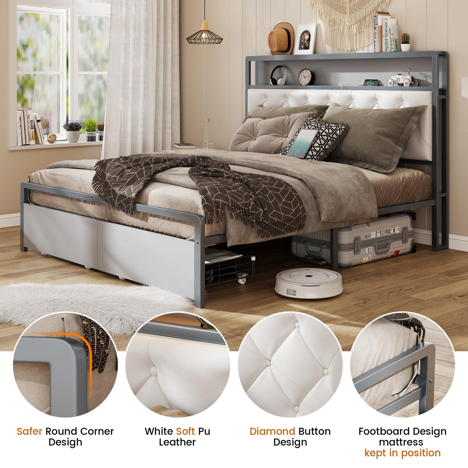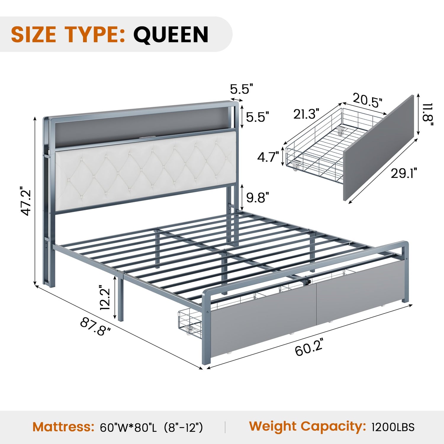 Queen Bed Frame with Upholstered Headboard and Storage,Metal Platform Bed Frame Queen Size with 2 Drawers/LED Lights/Charging Station/Footboard/Metal Slats Support,No Box Spring Needed,Noise Free,Grey