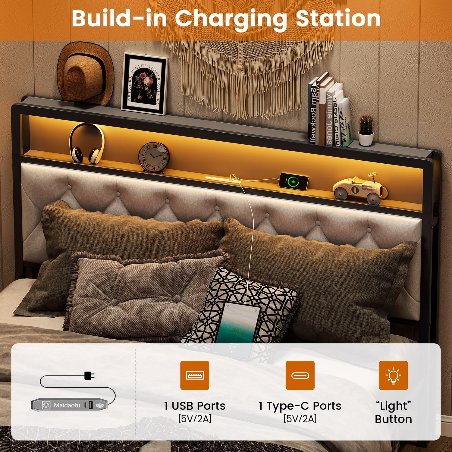 - Queen Platform Bed Frame with LED Lights & Charging Station: Headboard built-in led lights touch contorl, USB-C and USB port, making it very convenient to switch 3 light color and charge your electronic devices without leaving your bed