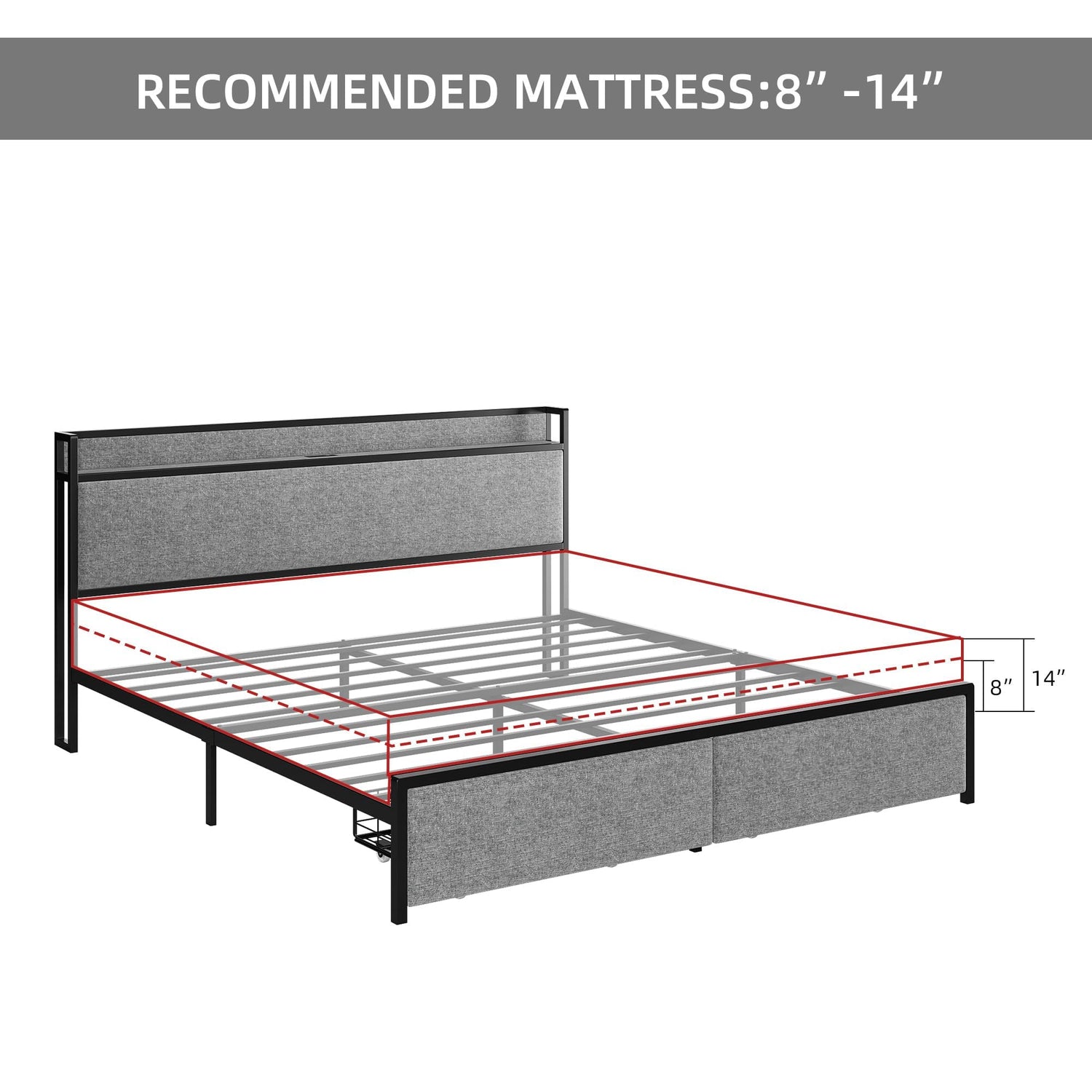 Queen Size Bed Frame with Charging Station Headboard and 2 Storage Drawer, Upholstered Platform Bed with USB Port & Outlets, No Box Spring Needed Storage Bed, Noise Free, Easy Assemble, Grey