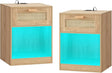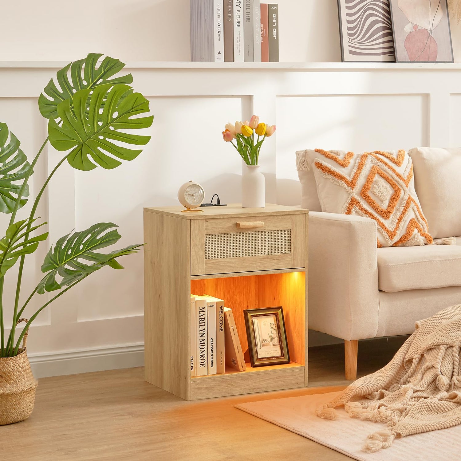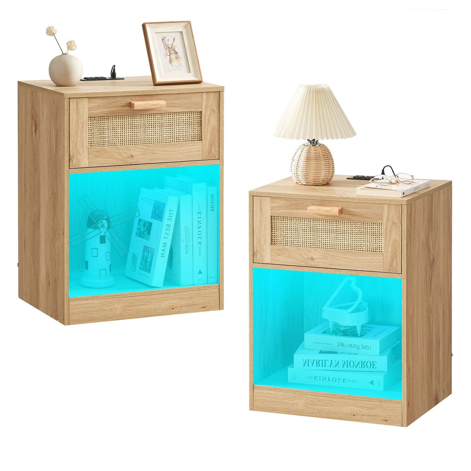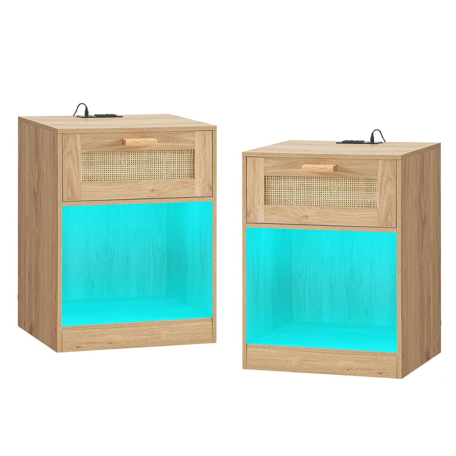 Rattan Nightstands Set of 2, Nightstands with Charging Station & LED Light, Night Stands