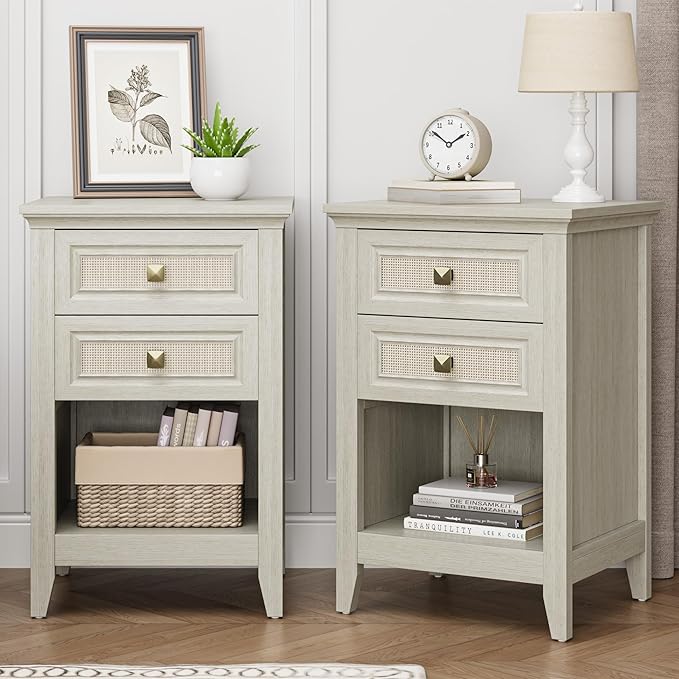 Farmhouse Nightstand Set of 2, Boho Bedside Table with 2 Rattan Decor Drawers, Wood
