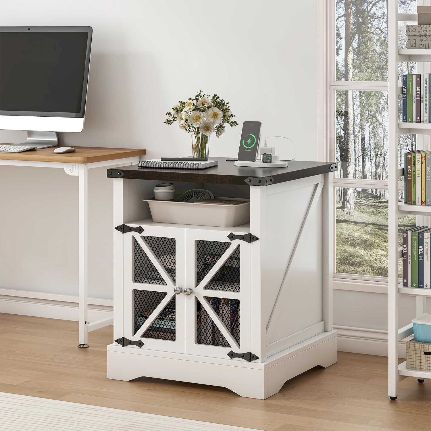 Farmhouse Nightstand with Charging Station, Large Sofa Side Table, Wood Square