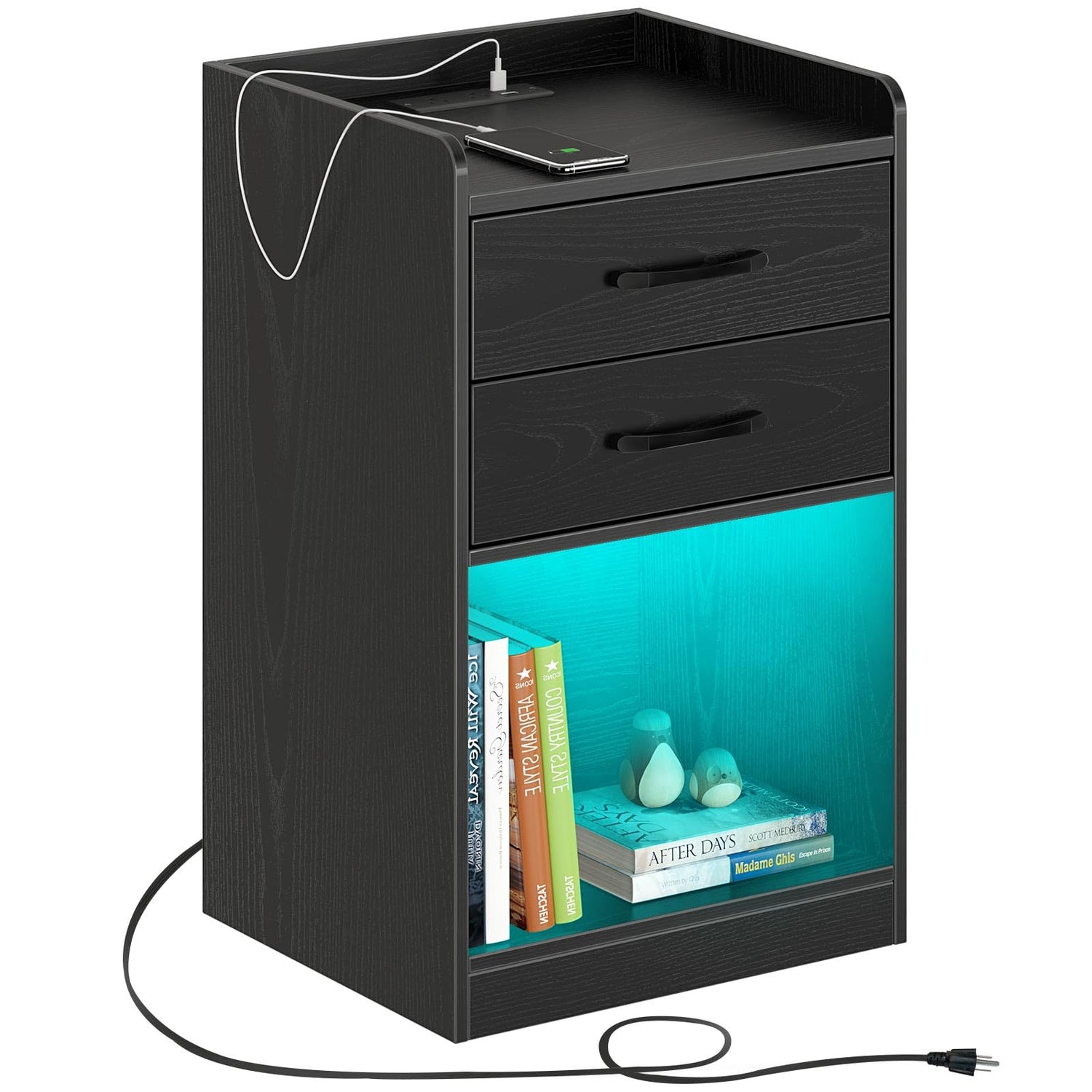 Nightstand with Charging Station and LED Lights, Modern Night Stand with 2 Drawers