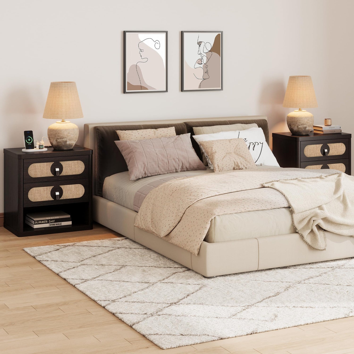 - The nightstands set of 2 bring a touch of luxury with the black walnut wood finish, and add a cozy warmth with natural linen-decorated drawers, making it great for your bedroom.