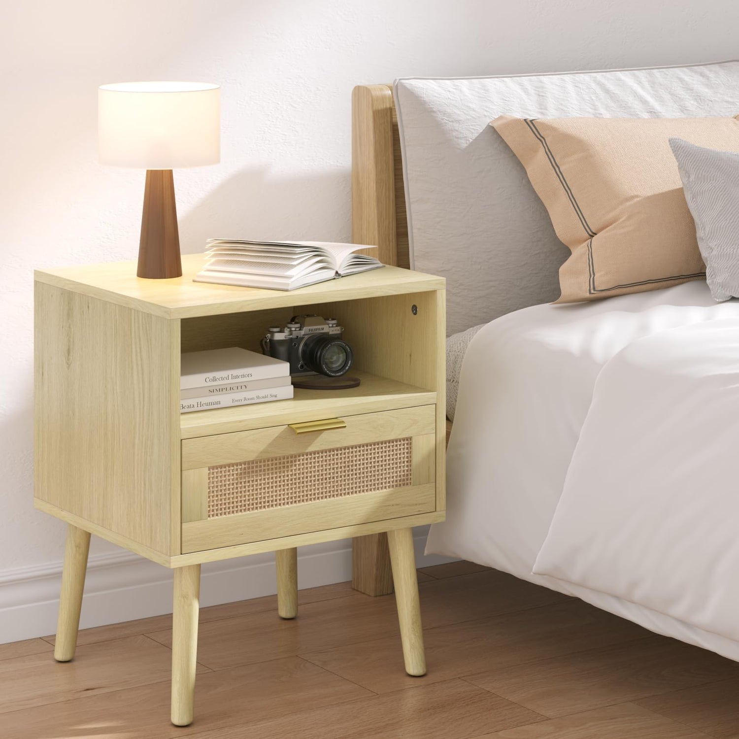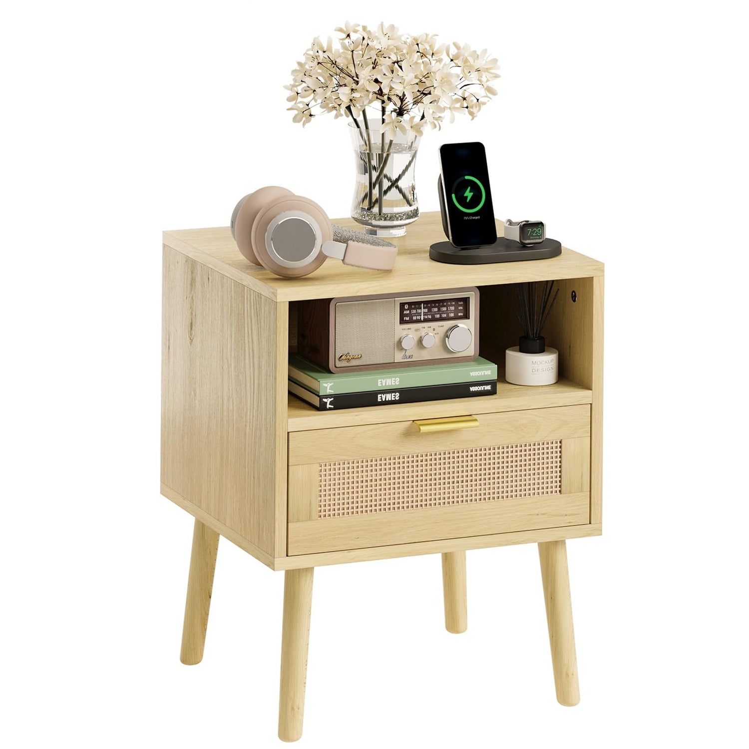 Rattan Nightstand, Boho Side Table with Drawer Open Shelf, Wood Accent Bedside End - Natural Oak is backordered and will ship as soon as it is back in stock.
