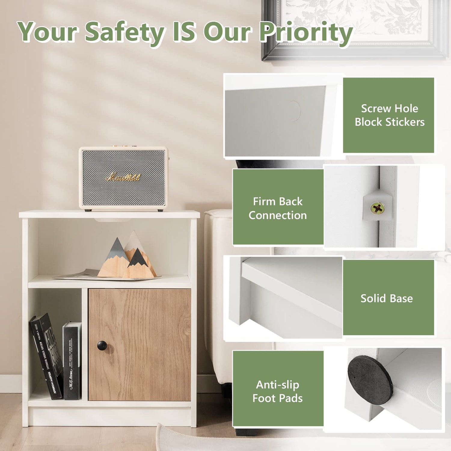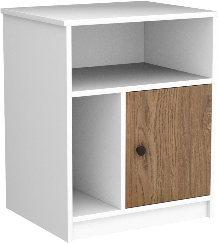 - This wooden nightstand consists of a spacious tabletop, upper open compartment, lower open compartment and enclosed cabinet with door. Thus, these storage spaces of different sizes can hold various items for easy access, such as photo frames, potted plants, aromatherapy, ornaments, clocks, books, etc.