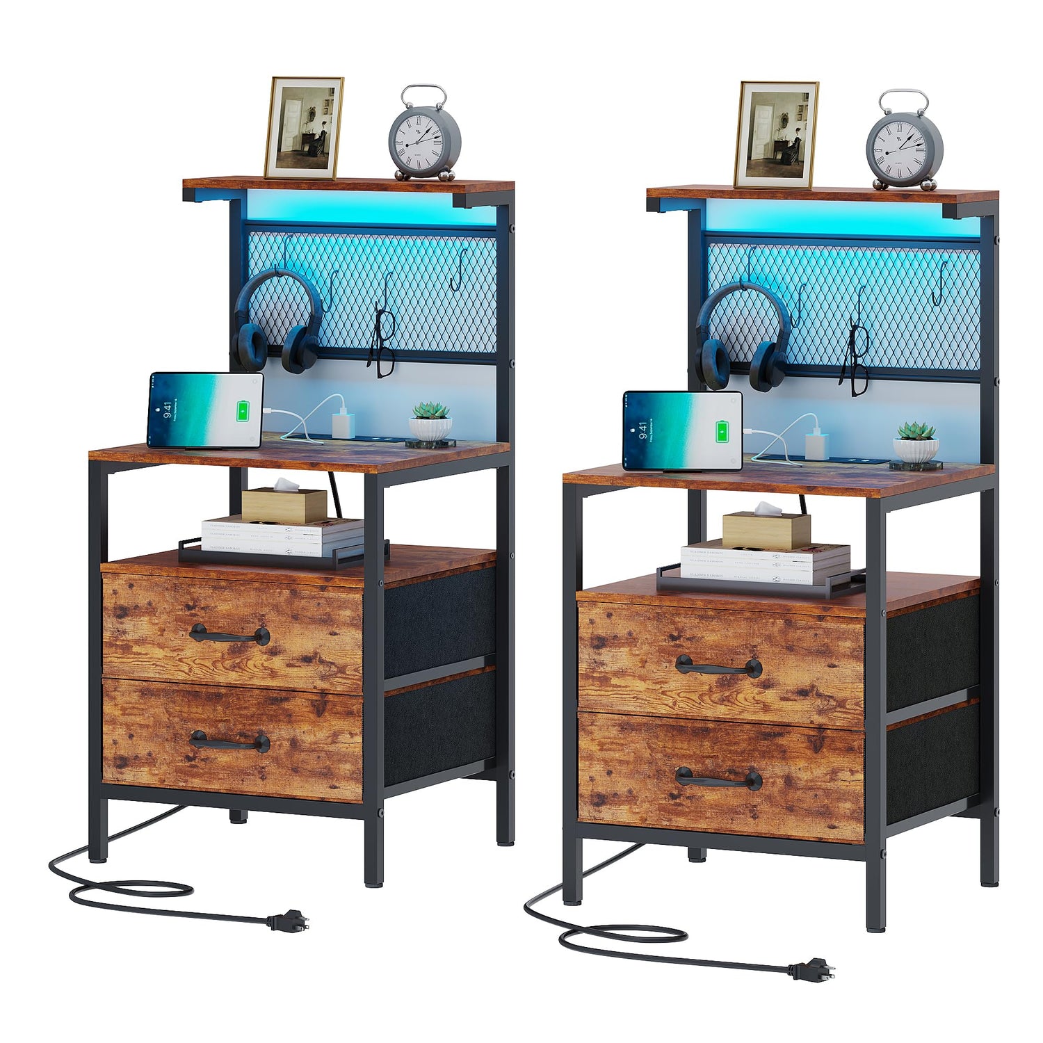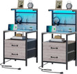 Tall Nightstand Set of 2 with Charging Station and LED Lights, Night Stand with Fabric