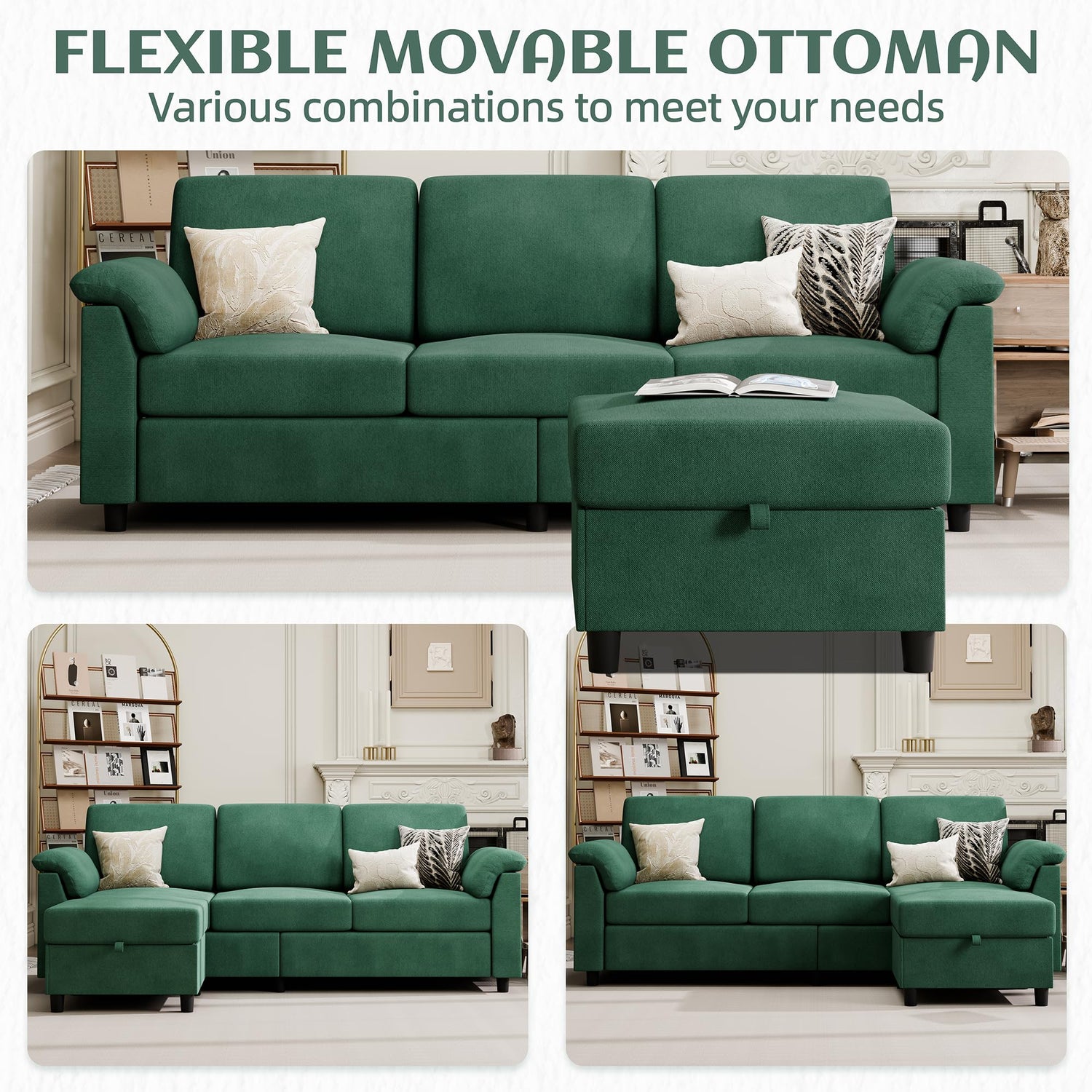 - Multi-purpose Design: This small space reversible sectional sofa with a movable ottoman, you can place square ottoman on left or right of sectional sofa to fit against the wall in your living room. You can use the variability of sofa to change the style of the room at any time.