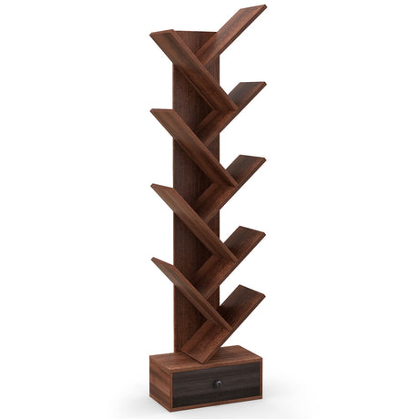 Tree Bookshelf with Drawer, 10 Shelf Space Saving Rustic Brown Wooden Bookcase
