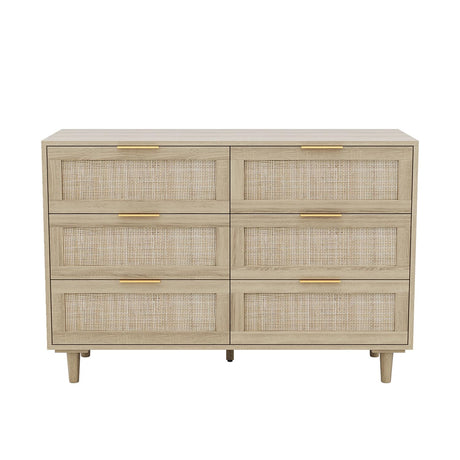 Rattan Dresser for Bedroom, Modern 6 Drawer Double Dresser with Gold Handles