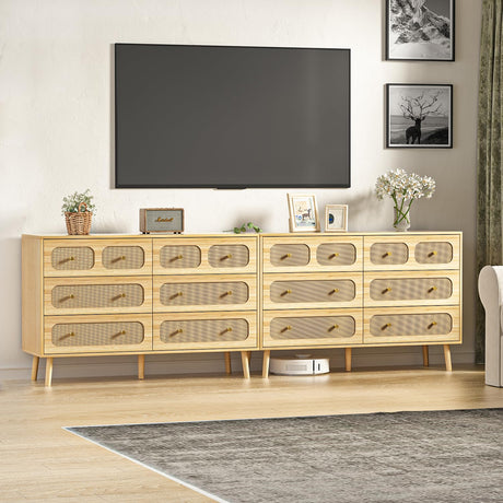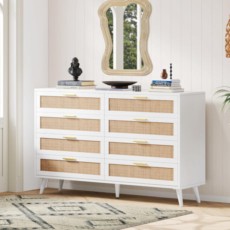 8 Drawer Double Dresser for Bedroom, Rattan Chest of Dressers, Modern Wooden