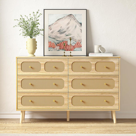 Natural Rattan 6 Drawer Double Dresser for Bedroom, Industrial Wood Clothing Organizer