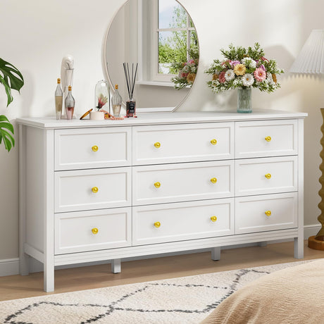White Dresser for Bedroom, 9 Drawer Dresser with Wide Drawers and Gold Metal Handles