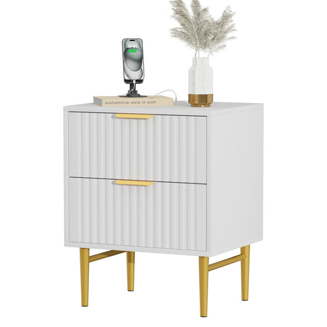 Nightstand with Charging Station, Side Table with 2 Drawers, Fluted End Table with Gold