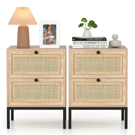 2 Drawers End Table for Living Room, Rattan Nightstand Bedside Table with Metal Handles