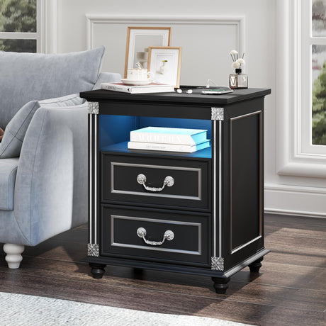 Black Nightstand with Charging Station, End Table with Glass Drawers, Night Stand with LED Lights,