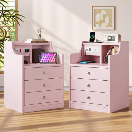 Nightstand with Charging Station,Pink Night Stand with Hutch,Bedside Table with Drawers,