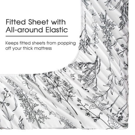 Floral Sheets Queen Size,18 inches Deep Pocket Sheets, 1800 Thread Count Black and White Leaf