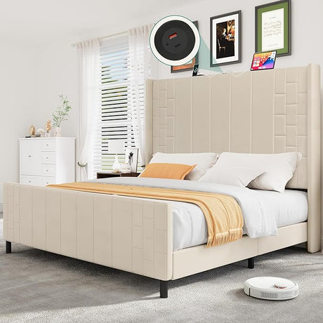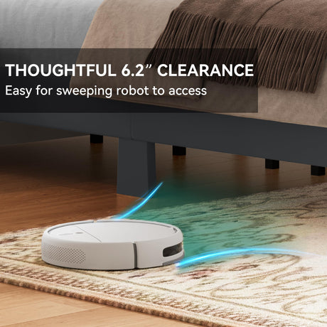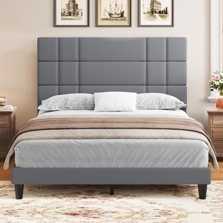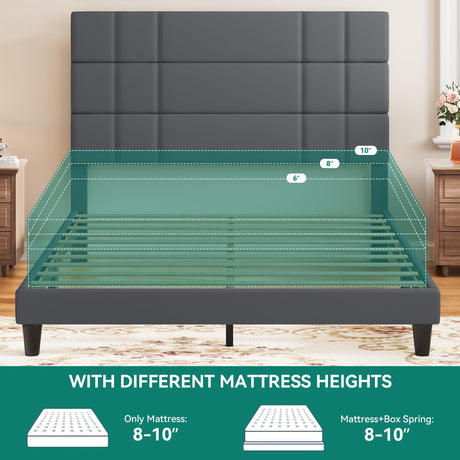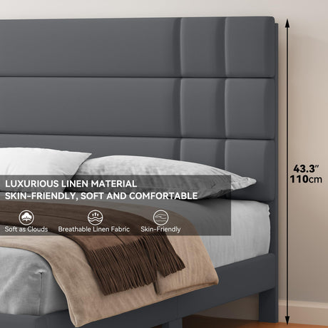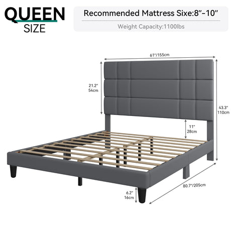Queen Size Bed Frame Linen Fabric Upholstered Platform with Headboard and Strong Wooden Slats,