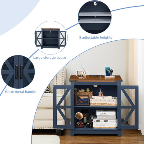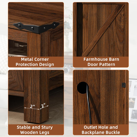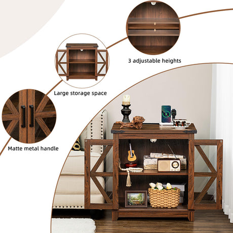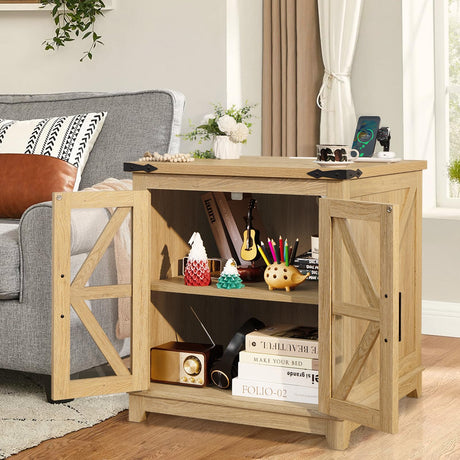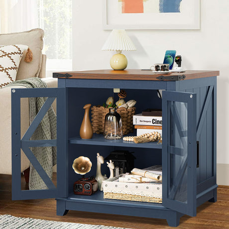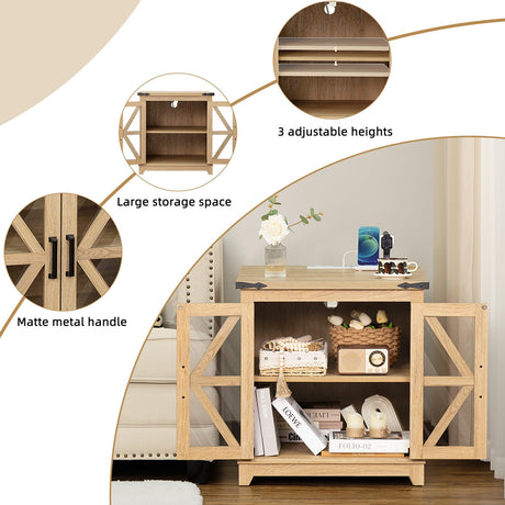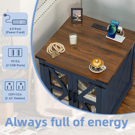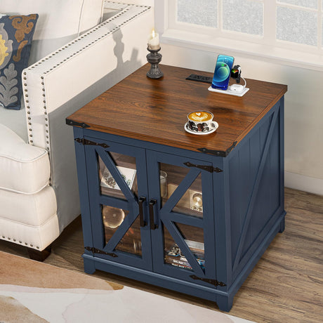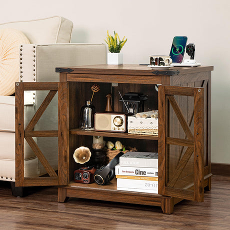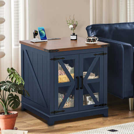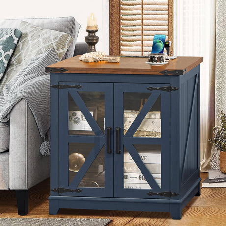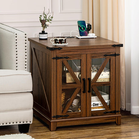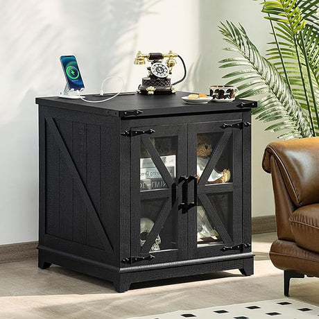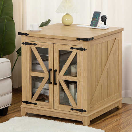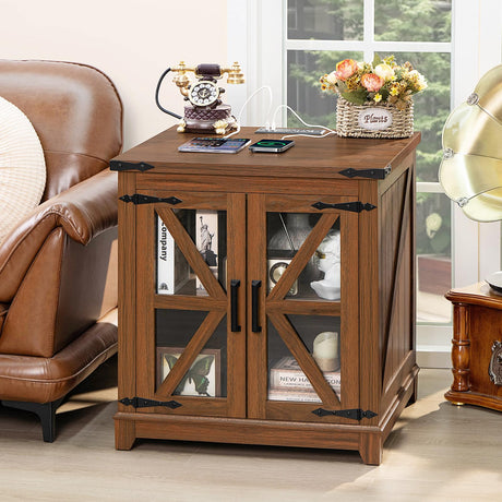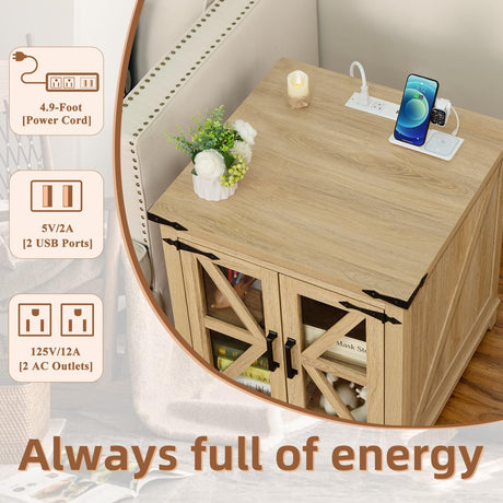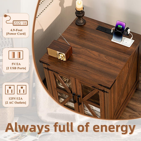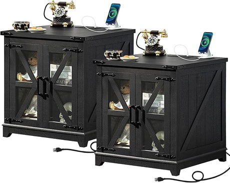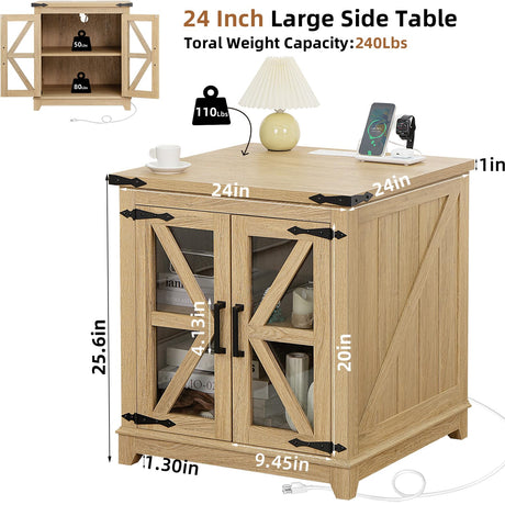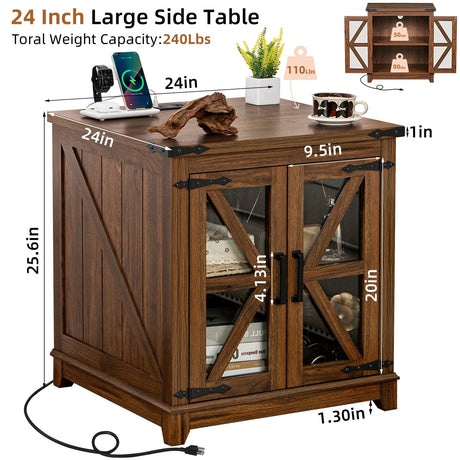 24" End Table Set of 2 with Charging Station, Farmhouse Night Stand with Glass Barn Door