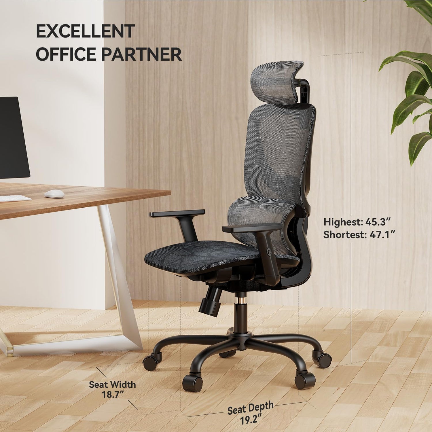 - [Multi-Adjustable Design] This high back office chair offers a 3.2″ adjustable seat height, a 45° adjustable headrest for enhanced support, 2D armrests that move up and down, and a 90°-130° rocking recline for both work and relaxation. It's suitable for individuals ranging from 4′11″ to 6′3″ in height.