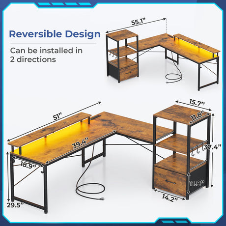 49" L Shaped Desk with Power Outlet & LED Lights, Reversible Corner Com