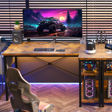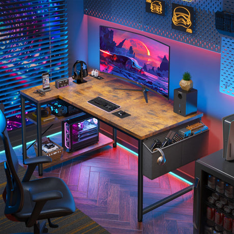 L Shaped Desk Gaming Desk with LED Light & Power Outlet, 53 Inch Reversible L Shaped Computer Desk