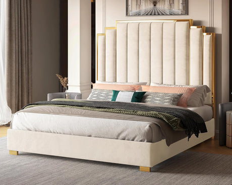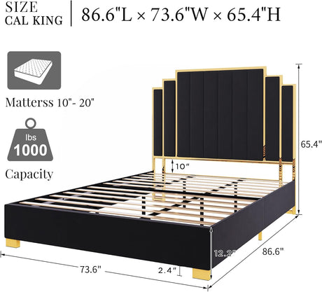 California King Platform Bed Frame - 65" Velvet Upholstered with Gold Trim
