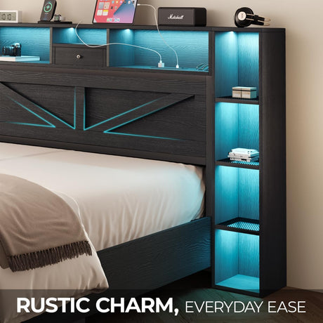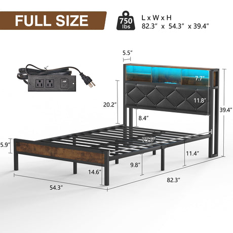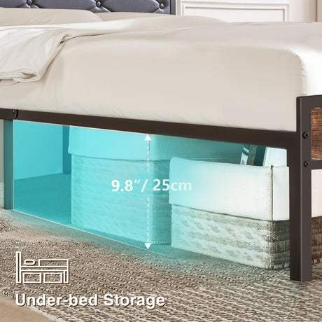 Full Size Metal Bed Frame with LED Lights, USB Charging & Storage