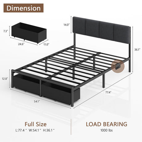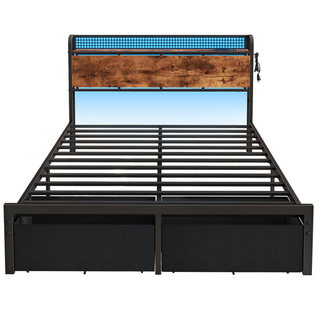 Full Size Metal Bed Frame with LED Headboard and Storage Drawers