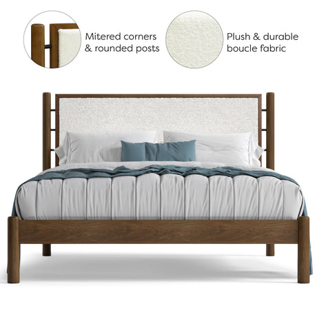 Queen Size Solid Wood Bed Frame with Upholstered Boucle Headboard