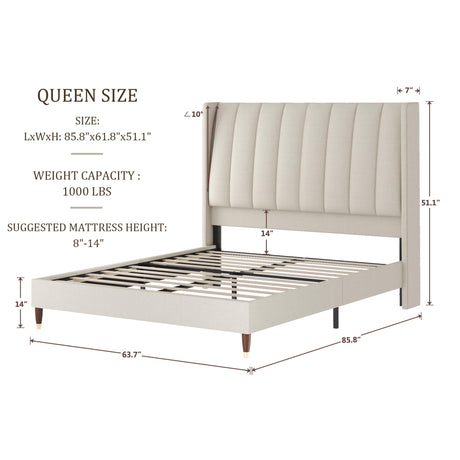 Queen Upholstered Bed Frame with Vertical Channel Wingback Headboard