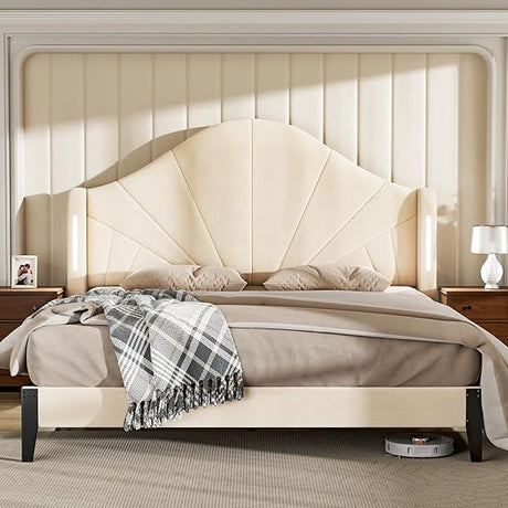 King Size Velvet Platform Bed Frame with LED Lights & Storage Drawers
