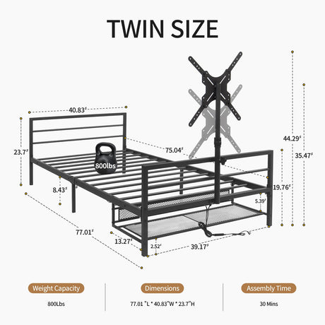 Twin Gaming Bed Frame with LED Lights & Rotating TV Mount