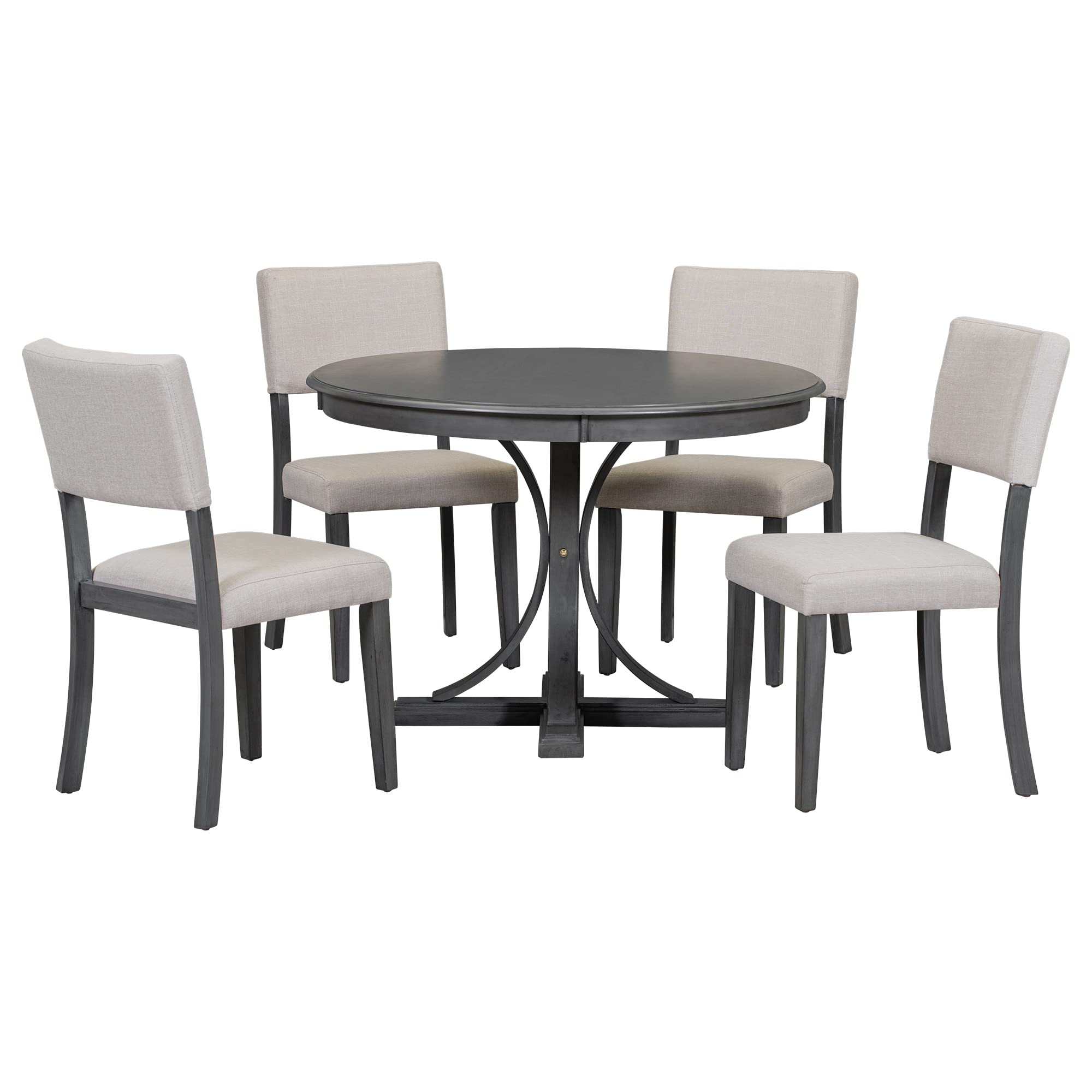 Retro Round Dining Table Set with Curved Trestle Style Legs and 4 Upholstered Chairs,