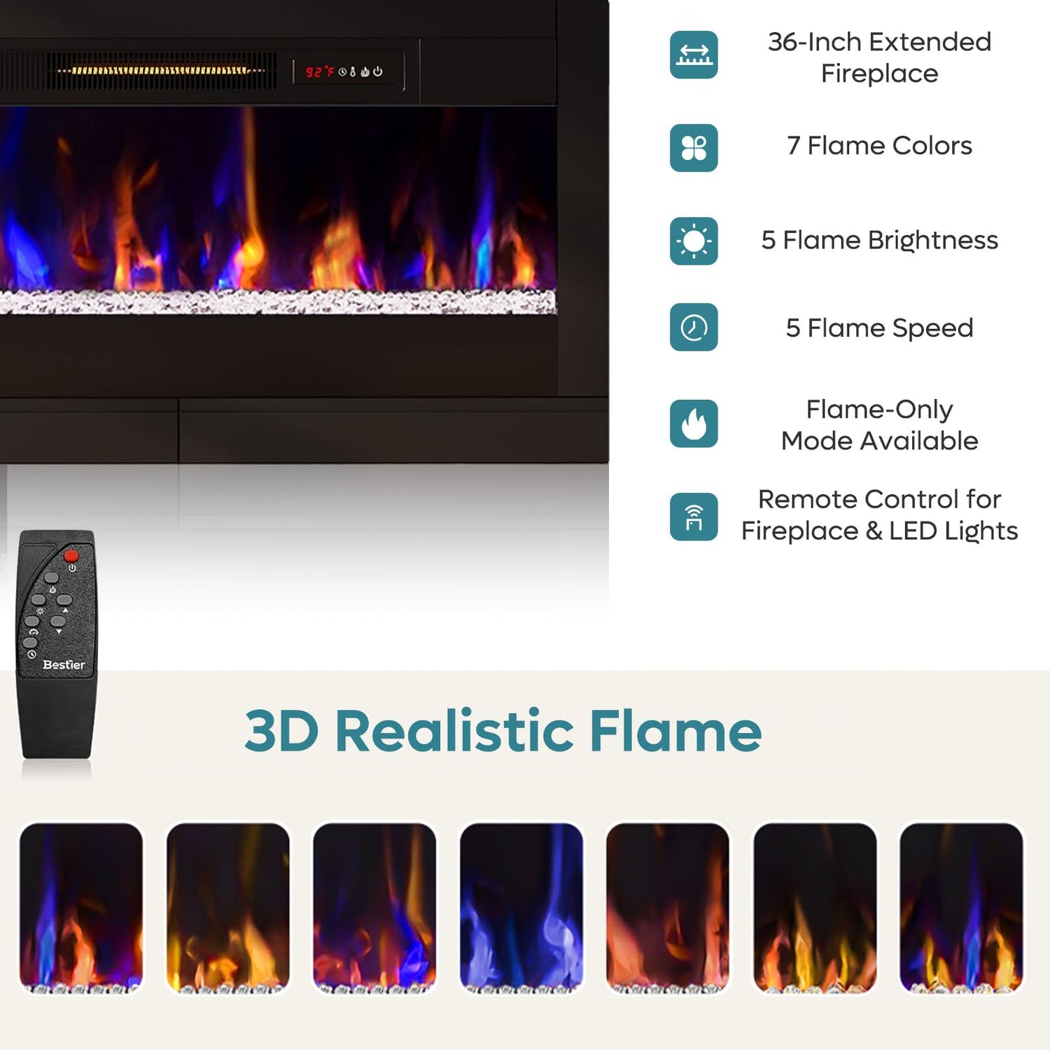 • Integrated 36-inch electric fireplace with realistic flame effects
