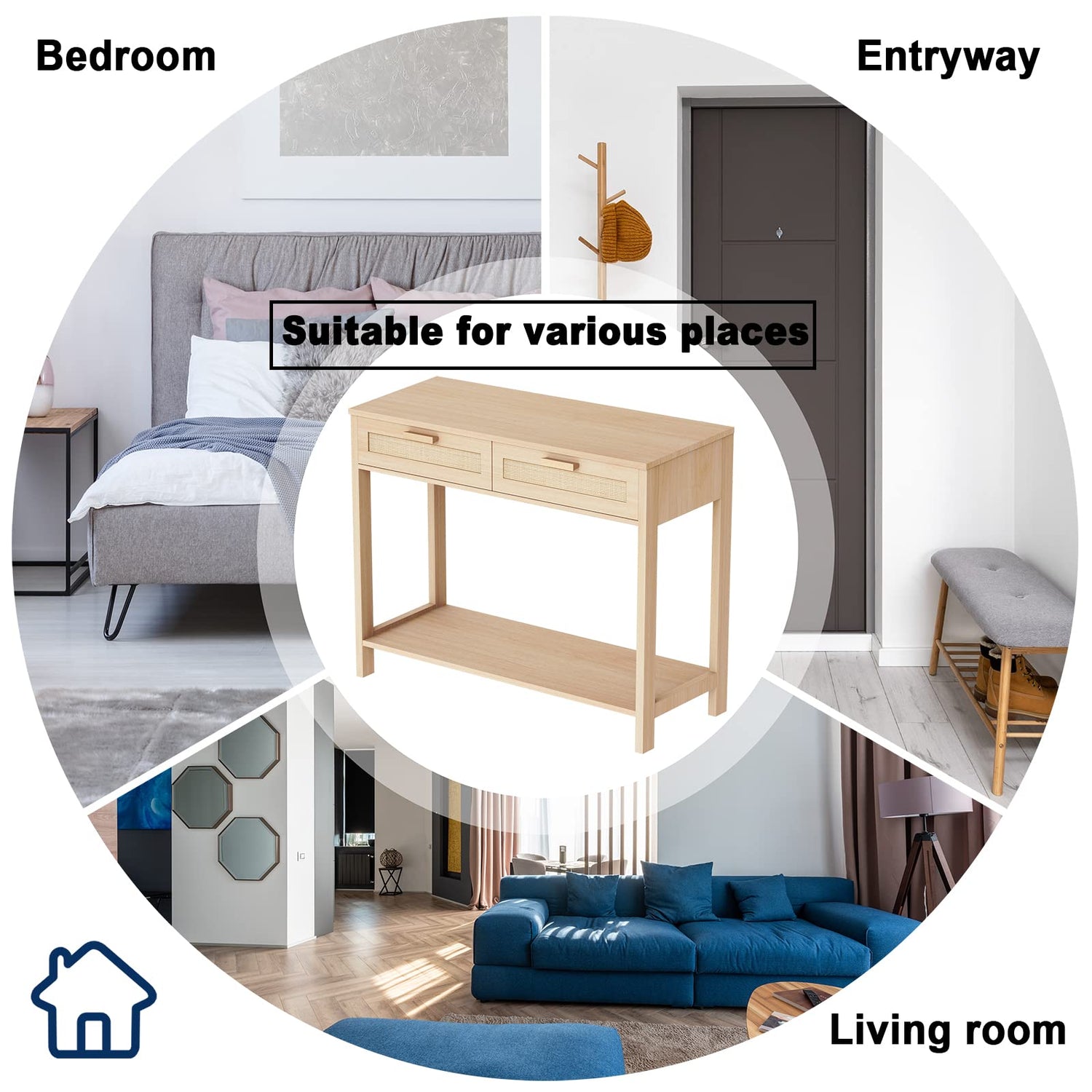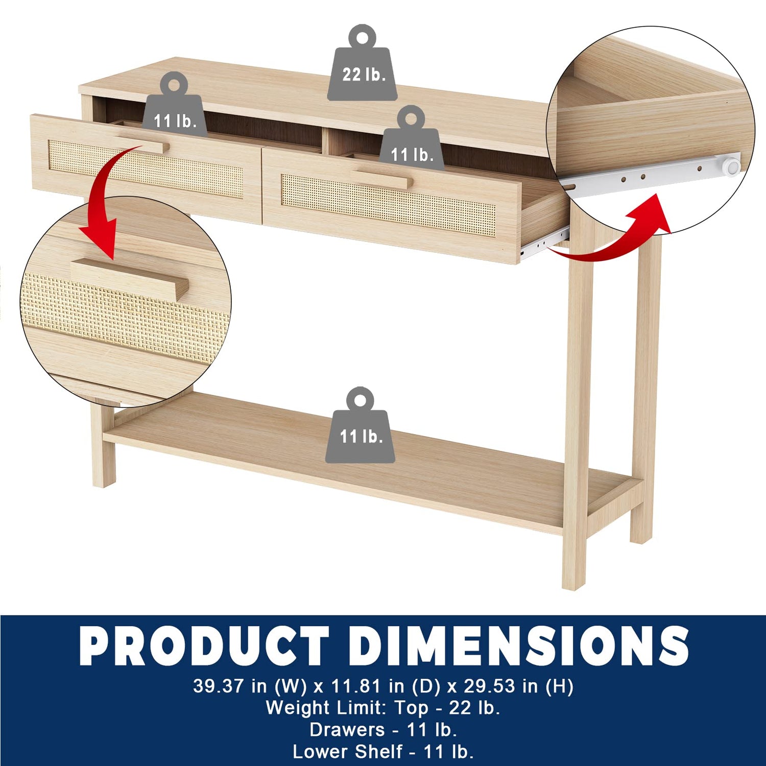 - RATTAN CONSOLE TABLE: Equipped with a skinny tabletop and 2 drawers, this cabinet provides ample storage space. The entry table top surface can hold 22 lbs, while the drawers and lower shelf can hold 11 lbs each. Assembled dimensions: 29.53''H x 39.37''W x 11.81''D. The rattan console table ships flat to your door and 2 adults are recommended to assemble.