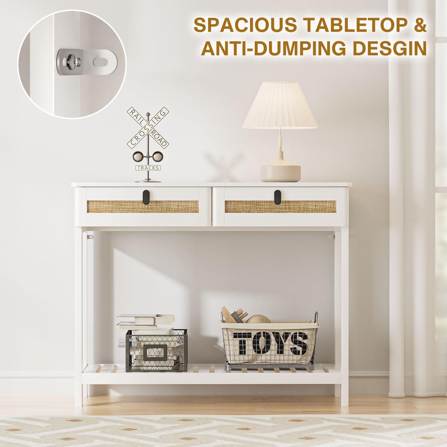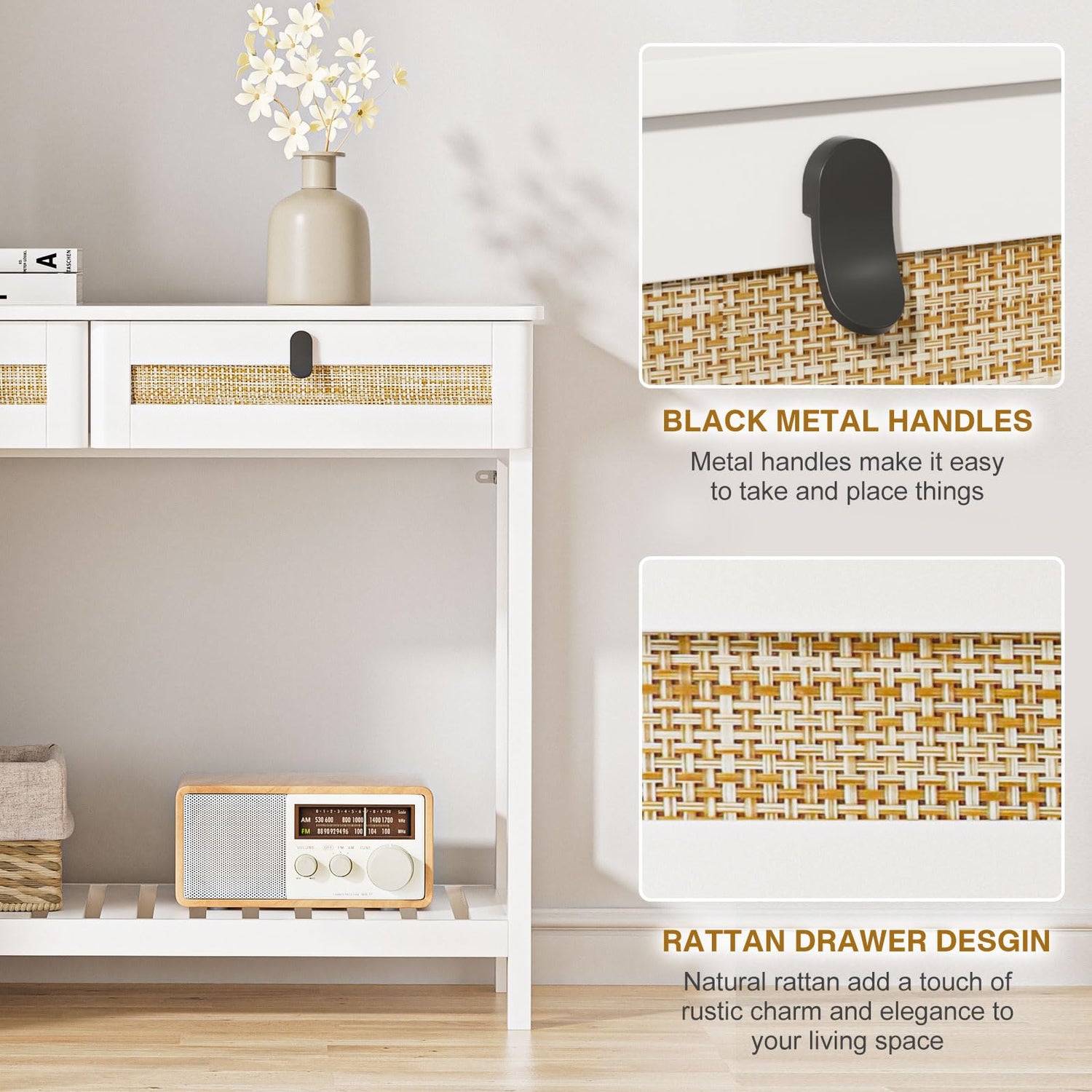 - [Console Table with Rattan Elements] The surface of 2 drawers adopts rattan weaving style. Classic white color and rattan elements in one feature, neat clean lines and edges. This farmhouse console table adds an elegant and modern touch to your house, blends well with any style decor and complete your various domestic occasions.