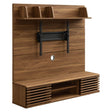 - CABLE MANAGEMENT - Mounting to the wall, this TV stand is crafted with particleboard, MDF, and wood grain laminate. Cable management holes keep cords out of sight and visual space clean