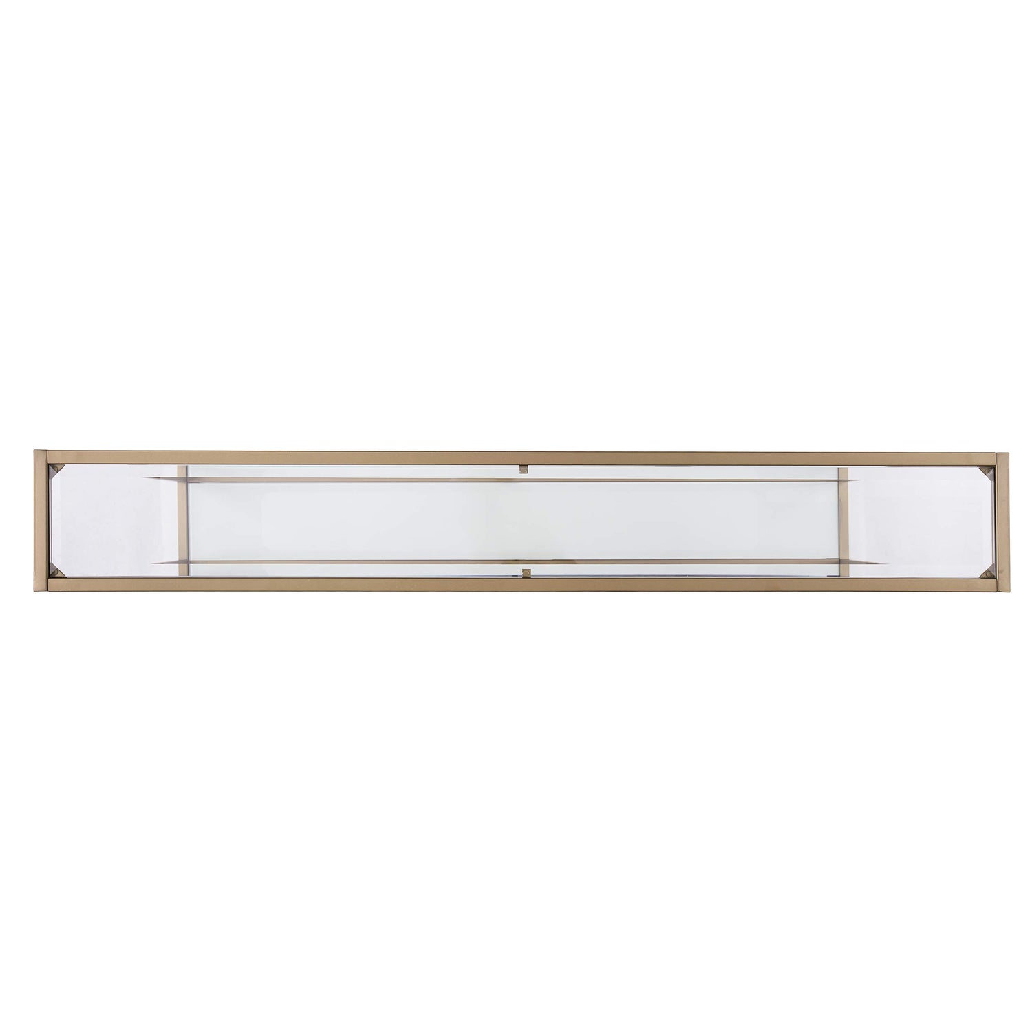 • Glass top shelf and white glass bottom shelf; Simple, linear look; Gold w/ white glass